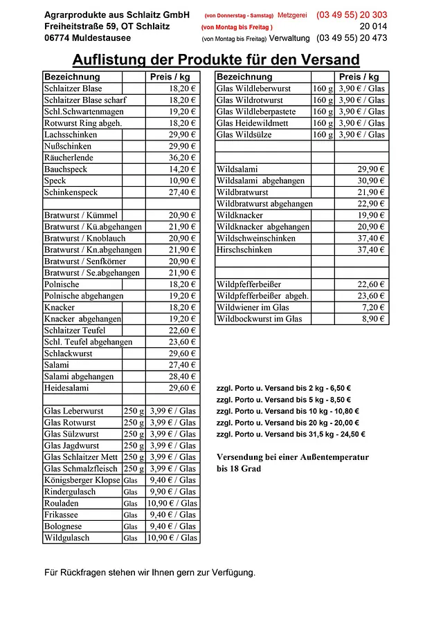 Alle Speisen nach vorheriger Bestellung - telefonisch unter 034955 20434 - auch zur Selbstabholung.